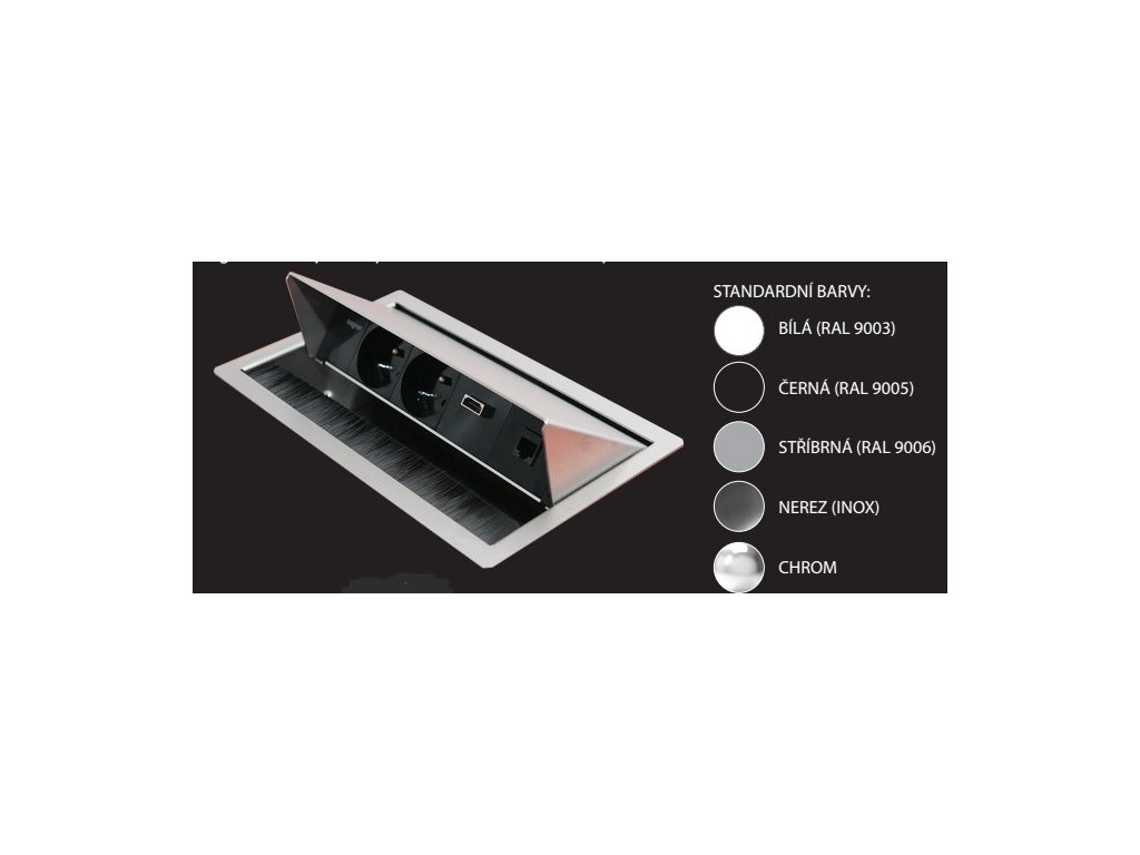 - Mechanicky výklopný zásuvkový panel montovaný do desky stolu