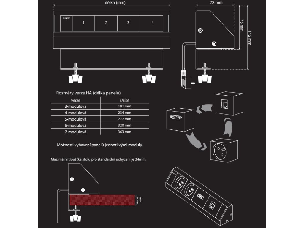 - Pevný zásuvkový panel dvojitý- nezapuštěný, montovaný na kraj stolu za pomocí integrované konzoly